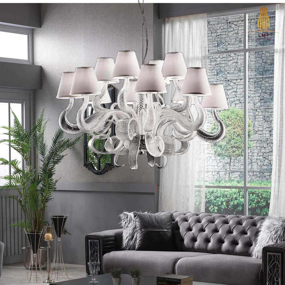 Đèn VDM-12 sử dụng chao chụp vải, nhấn mạnh nét thanh lịch và quý phái của các mẫu đèn chùm cao cấp. Thiết kế đèn nghiêng về hướng cổ điển nhưng vẫn rất xinh đẹp nếu bố trí hợp lý trong không gian hiện đại. Tone màu trắng sữa ở chao chụp kết hợp thân khung trắng trong mang đến một vẻ ngoài trang nhã cho đèn. Mẫu đèn này hứa hẹn sẽ giúp không gian tiền sảnh, khu vực phòng khách của các biệt thự, villa trở nên hoành tráng, hoa lệ hơn.