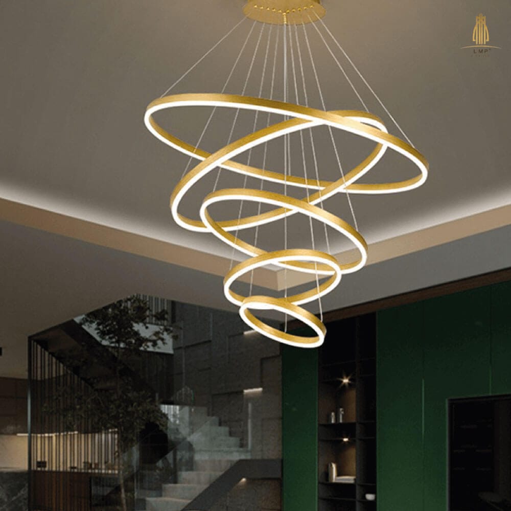 Ánh sáng led được bố trí sẵn bên trong 5 vòng đèn. Ánh sáng chiếu xuống dưới, cung cấp nguồn sáng lan tỏa đồng đều trong không gian. Nguồn sáng này được đánh giá cao về hiệu quả soi chiếu ổn định cũng như tính thẩm mỹ. Với ánh sáng led, đèn góp phần tạo nên bầu không khí sang trọng trong khu vực bố trí.